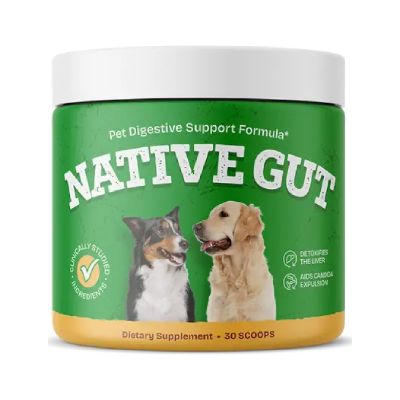 NativeGut is a daily digestive health supplement formulated specifically to support gut balance and intestinal wellness in dogs. It is designed to nourish the gut microbiome by providing beneficial probiotic strains that help improve digestion and maintain digestive comfort.
